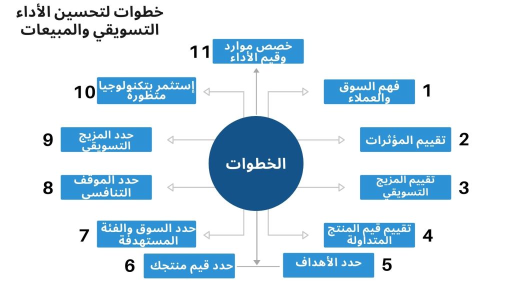 تعد إدارة المؤسسة الصناعية خطة استراتيجية للمبيعات والتسويق لتحديد ما ينتج ويباع وآليات البيع والتي عادة ما تكون مشتقة من استراتيجية المؤسسة الشاملة. لإعداد استراتيجية التسويق والمبيعات، تدرس إدارة المؤسسة السوق لفهم العملاء والمنافسين والمزيج التسويقي المتداول وتنتهي في صياغة استراتيجية التسويق والمبيعات، والتي تتضمن كل من صياغة فكرة المشروع التسويقية، والإطار الاستراتيجي، والمقاييس الكمية للاستراتيجية. تشمل الفكرة التسويقية على المشاكل التي يواجها جمهور المستهلكين، والحلول والقيم النسبية والنموذج البصري للمنتج، ووصف للعملاء المستهدفين، وتقدير حجم السوق المستهدف. بينما يتضمن الإطار الاستراتيجي للتسويق والمبيعات على التوجه الاستراتيجي، والموقف التنافسي، والأهداف، والمبادرات الاستراتيجية، والخطة التنفيذية، ومؤشرات الأداء الرئيسية، والموارد المطلوبة. وتتضمن المقاييس الاستراتيجية على التفاصيل الكمية للمبيعات المستهدفة والمزيج التسويقي وكلفة التسويق والتوزيع وغيرها. إن عملية تحسين أداء المبيعات والتسويق لأي مؤسسة هي عملية مستمرة لتحديد وإدارة الفرص والمزايا النسبية، مثل احتلال حصة أكبر من السوق، وزيادة عدد المستهلكين، وصناعة منتجات ذات قيم فريدة، ومزيج تسويقي مبتكر، ومحفز للمستهلكين. فيما يلي بعض الخطوات التي يمكن أن تساعد المؤسسة على تحسين مبيعاتها وأدائها التسويقي: