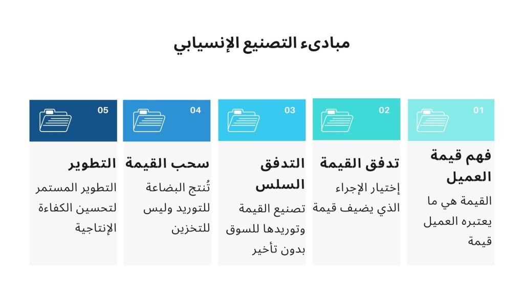 المبدأ (5) – التطوير: هي عبارة عن تنفيذ دقيق للمبادئ الأربعة أعلاه وتشجيع تطوير العمليات بشكل مستمر لتحقيق كفاءة إنتاجيه عالية.