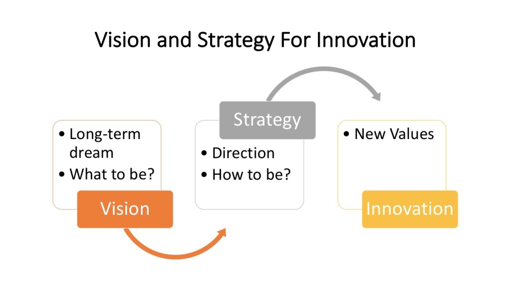 No one can make any innovation without having a creative vision and strategy. Vision is a long-term dream about a business or product, whilst strategy identifies the best ways to implement the vision. In this article, I discuss the importance of the vision and strategy elements in creating innovation and show steps to develop each of them.