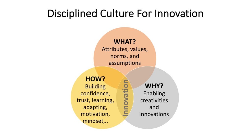 - Innovation by definition is practical creativity; thus, discipline culture can encourage creativities among employees by spreading the values and norms of initiation, proactiveness, and creativity to improve the way teams work and outcomes.