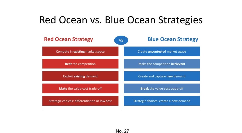 Blue oceans denote all the industries not in existence today and unknown market spaces. Blue oceans reveal untapped market space, demand creation, and opportunities discovering for profitable growth. Most blue oceans are created from within red oceans by expanding existing industry boundaries. In blue oceans, competition is irrelevant because the game rules are unknown. On the contrary, red oceans deal with the existing market, the competition rules are known to all players, and differentiation strategies may exist to protect competitors’ market shares.