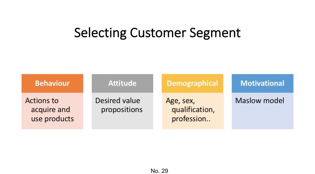- Value segmentation: is about segregating the market on the need of the product’s value proposition. For example, a customer segment will set the required specification and features of computers as the size, weight, speed, or memory to buy.