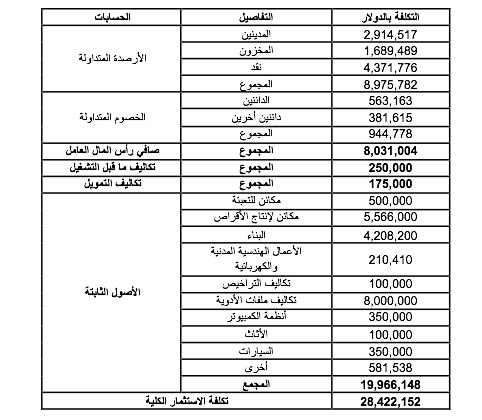 فيما يلي هيكل رأس المال (هيكل التمويل) لمنشأة تصنيع أدوية في مملكة البحرين: