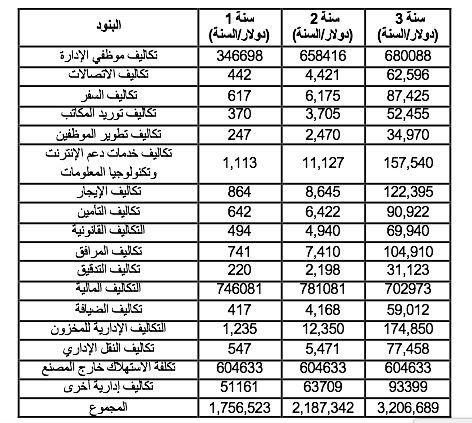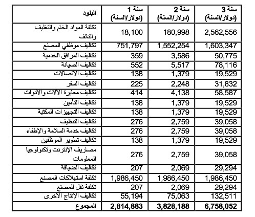 الخطوة 7- وفقاً لأعلاه، تقدير المصاريف التشغيلية السنوية (دولار/سنة) وتقديراتها للسنوات القادمة ولكل من مصاريف الإنتاج والمبيعات والتسويق والإدارة العمومية.