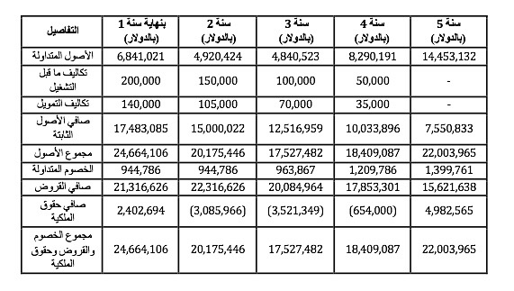 الخطوة 3- تقدير صافي قيمة رأس المال العامل (رصيد الأصول المتداولة مطروحاً منه رصيد الخصوم المتداولة) كرصيد افتتاحي (وفقاً لوثيقة الكلفة الاستثمارية) عند بدأ التشغيل وبنهاية كل عام ولمدة (5-10) سنوات.